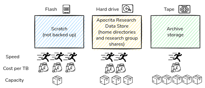The Apocrita Research Data Storage has a capacity of over five petabytes. This uses the IBM Storage Scale high-performance clustered file system which provides concurrent high-speed file access to your data.