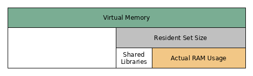 Memory usage can be broadly simplified into two values, Virtual Memory (VMEM) which a program believes it has and Resident Set Size (RSS) which is the actual amount of memory it uses.